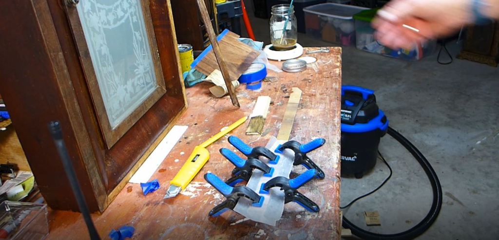 Once the veneer is attached to the trim piece and allowed to dry for 24 hours it is time for gluing and clamping the right and bottom border strips to the case.