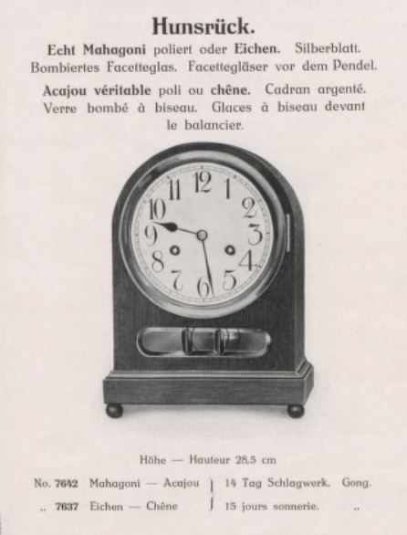 The 1915 Junghans catalog identifies the clock as the Hunsruck, named after a mountain range in Germany, and provides its specifications as 28.5 cm in height with a mahogany or oak case construction, a 14-day run time, and a silvered dial. This clock is the mahogany cased model.