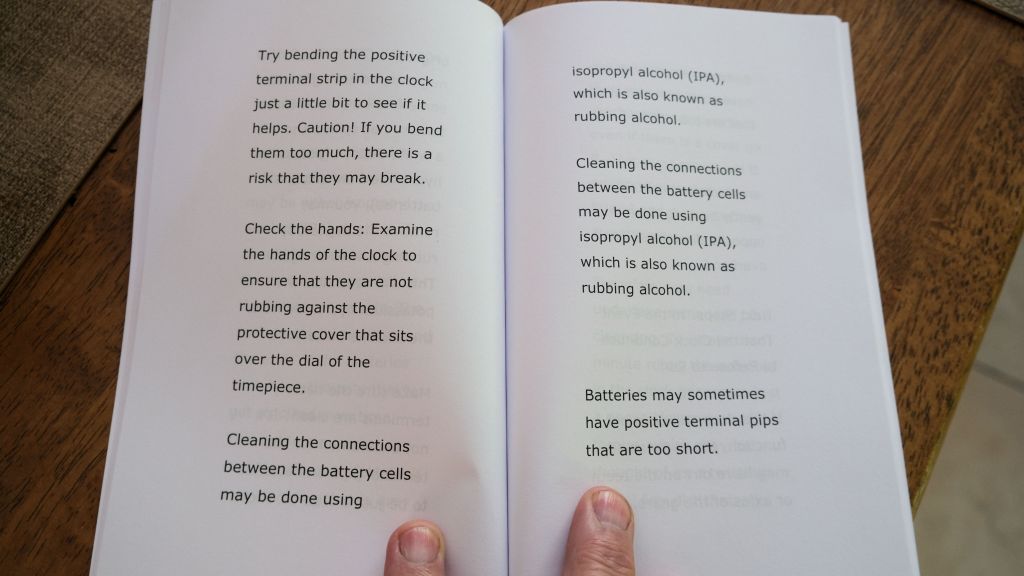 There are six chapters. In chapter four, “Why do clocks stop When They Do?”, I will quote the entire chapter, “Connections to the battery that are loose or unclean. Low battery warning. Battery pips are insufficiently long. Due to the accumulation of dirt and grime in the mechanism, there was an excessive amount of friction”. It’s puzzling why a manual would be dedicated to battery-operated clocks, as these are typically disposed of rather than repaired in our throwaway society.