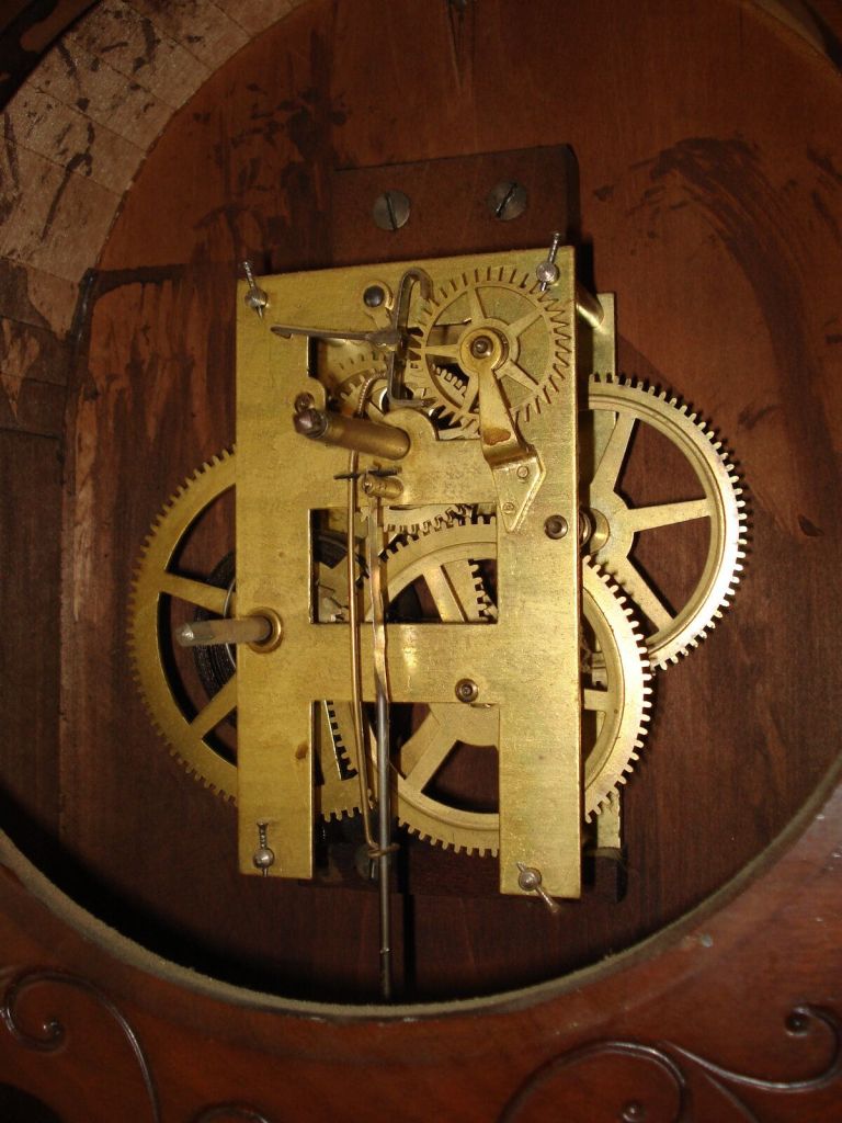The softwood case is veneered in Rosewood veneer accents. The clock’s case must have been quite elegant at one time, but now it is showing much wear and tear.