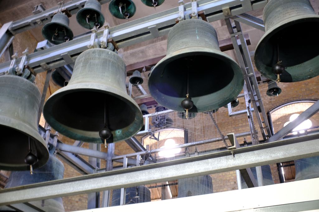 The tower’s carillon contains 49 bells. Historically, the bells played an important role in marking time and broadcasting messages to the town.