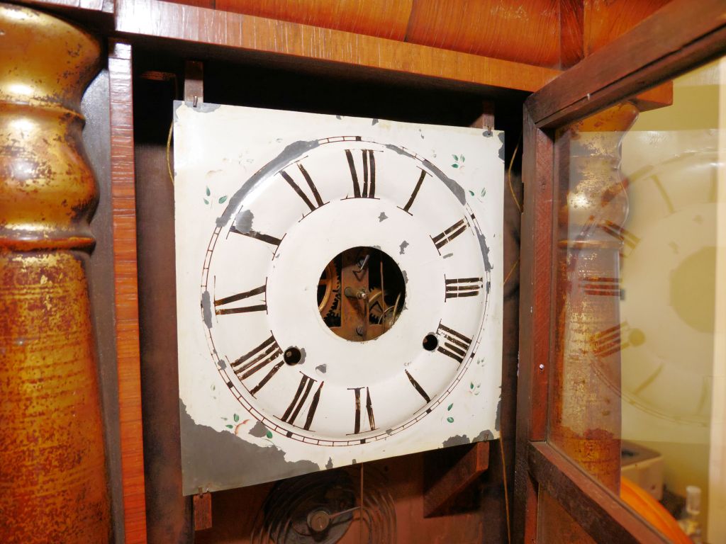 Among collectors an appropriate descriptor for this clock is “column and cornice” but it is also generally classified as a shelf clock. This particular clock features a hook on the top of its case, likely intended by a past owner for installation that way. While I have seen similar clocks mounted like this online, they were never originally designed to be hung.