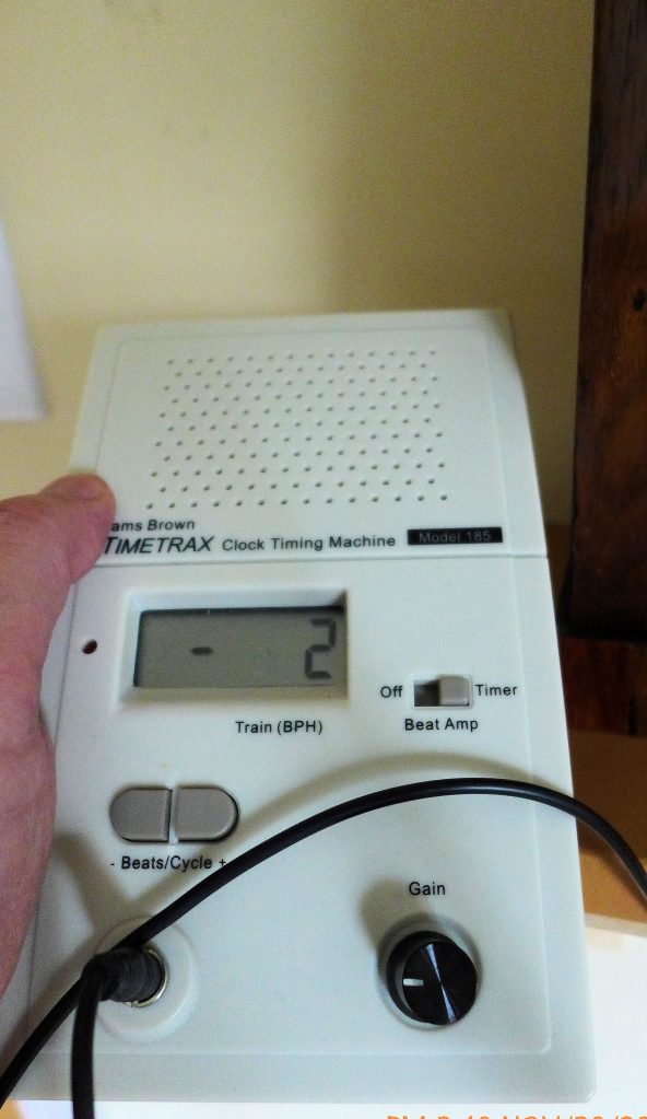 A beat adjustment was unnecessary as the clock was already leveled. If leveling were needed, it would simply involve slightly bending the crutch incrementally to find the beat. While checking the beat can easily be done by ear, it made sense to use my Timetrax device for greater precision.