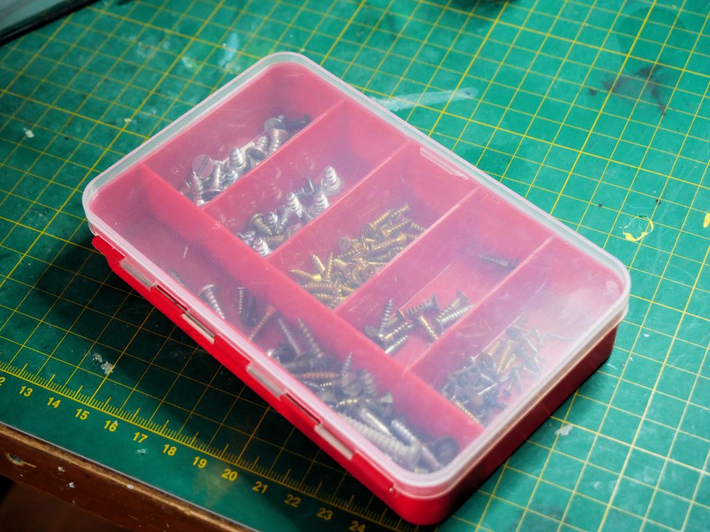 A dollar store is a great place to find all sorts of practical containers that are both useful and very affordable. This one, with separate compartments, is ideal for storing an assortment of different-sized screws.