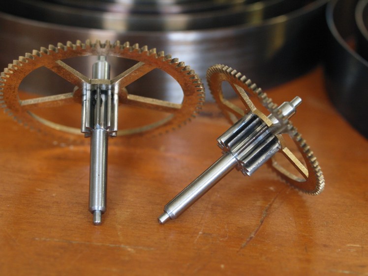 I disassembled the movement, put all the parts in an ultrasonic cleaner, dried the parts after the cleaning, pegged the pivot holes, polished the pivots, and now checked for wear. I generally assemble the trains separately with the strike side first, since often it is the greater source of wear. I then move to the time side.