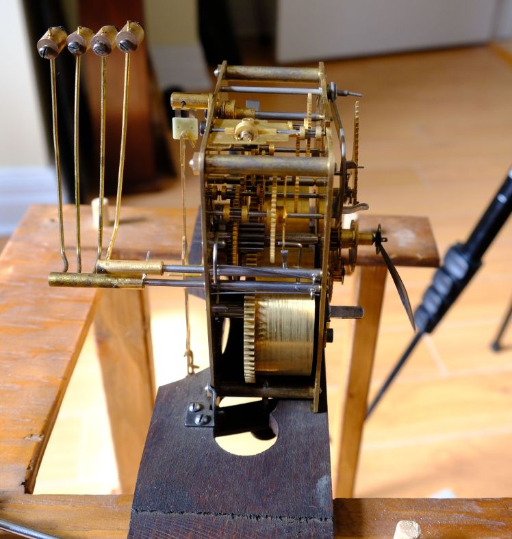 I take a cautious step-by-step approach during the testing phase. I wind the time side first, observe the movement and the action of the escapement, and make any necessary adjustments to ensure that once the movement is level, the escapement is in beat. I then run it for 24 hours.