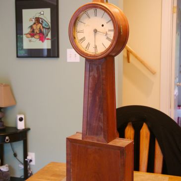 The American Banjo clock — often just called a banjo clock — got its name from the shape of its case, which resembles a banjo musical instrument. Although the design was patented in 1802 by Simon Willard, a renowned clockmaker from Roxbury, Massachusetts, Willard referred to his invention as the “Improved Timepiece,” not a banjo … More Echoes of an Unknown Maker: A Banjo Clock’s Journey Through Time