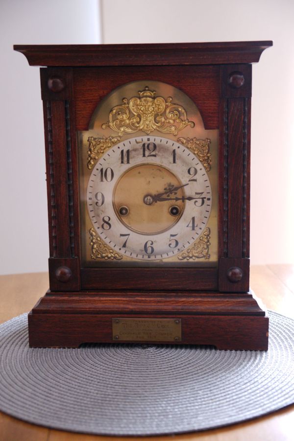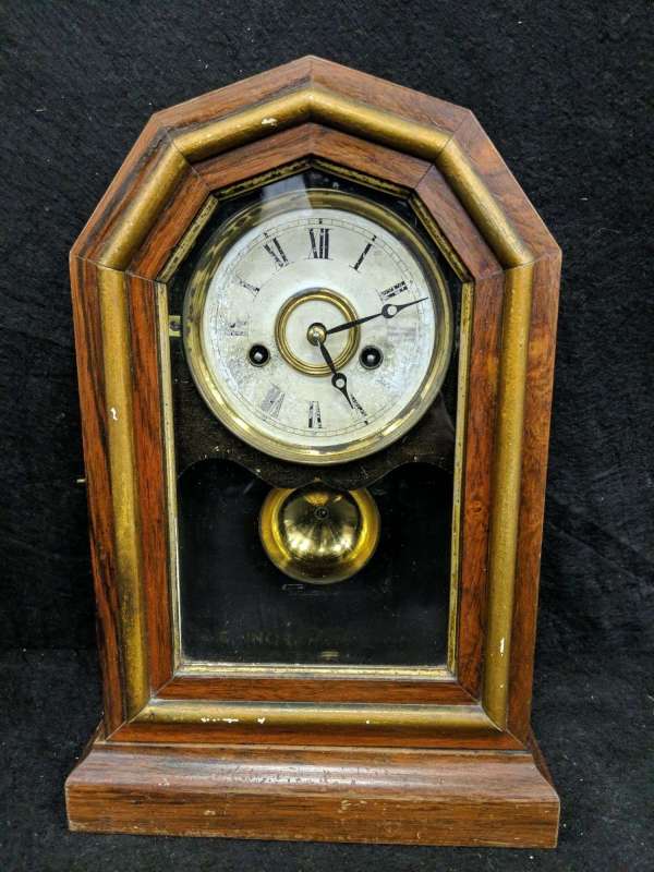 Seth Thomas and other makers made similar cabinet style cases but this is the Wren by the Waterbury Clock Company. Being a marriage, the clock is worth much less to those particular about such matters. No matter, it looks attractive.