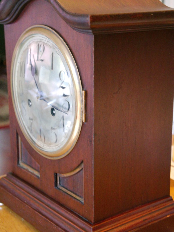 The Regency style veneered mahogany case of this Junghans time and strike bracket clock is in reasonably good shape save for a small piece of veneer missing on the front right corner and replacement chrome feet which look decidedly out of place.