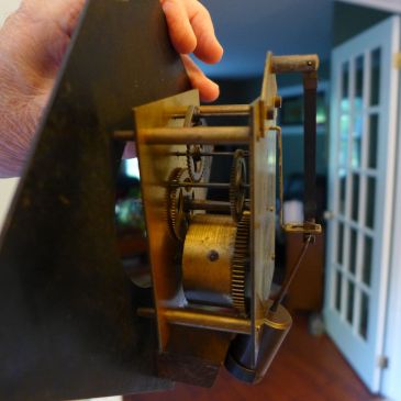 The American Banjo clock — often just called a banjo clock — got its name from the shape of its case, which resembles a banjo musical instrument. Although the design was patented in 1802 by Simon Willard, a renowned clockmaker from Roxbury, Massachusetts, Willard referred to his invention as the “Improved Timepiece,” not a banjo … More Echoes of an Unknown Maker: A Banjo Clock’s Journey Through Time
