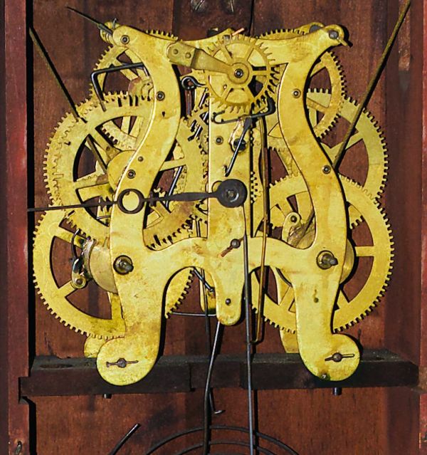 I purchased this clock from an antique collector who had owned it for a number of years. He decided to sell it in his antique shop in Great Village, Nova Scotia, and I found the price to be reasonable. The case, face, and bezel are all in excellent condition. However, the clock had an annoying squeak that suggested something was wrong. After investigating, I discovered that the first wheel had considerable pivot hole wear.