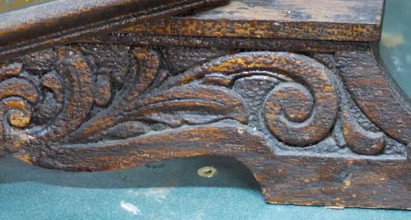 I first had to strengthen the side mounts with high-strength hide glue and slotted screws salvaged for an old clock case. It was not enough to screw the backboard which was in two sections into the side rails so, I fashioned a cross brace of salvaged pieces from an old 140-year-old ogee clock.