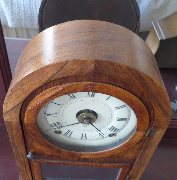 It is a rather large round top shelf clock measuring 15 inches in height, 10 inches wide at the base, and 4 inches deep. The attractive Rosewood veneered case has a mirrored rectangular lower tablet. I have seen some with clear glass but I believe the original design called for mirrored glass.