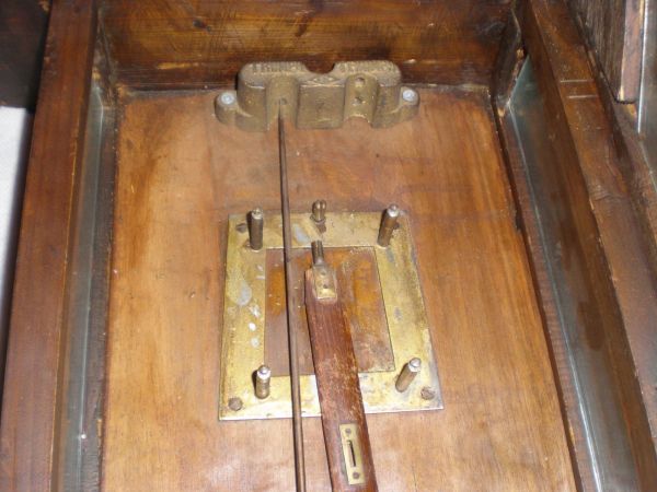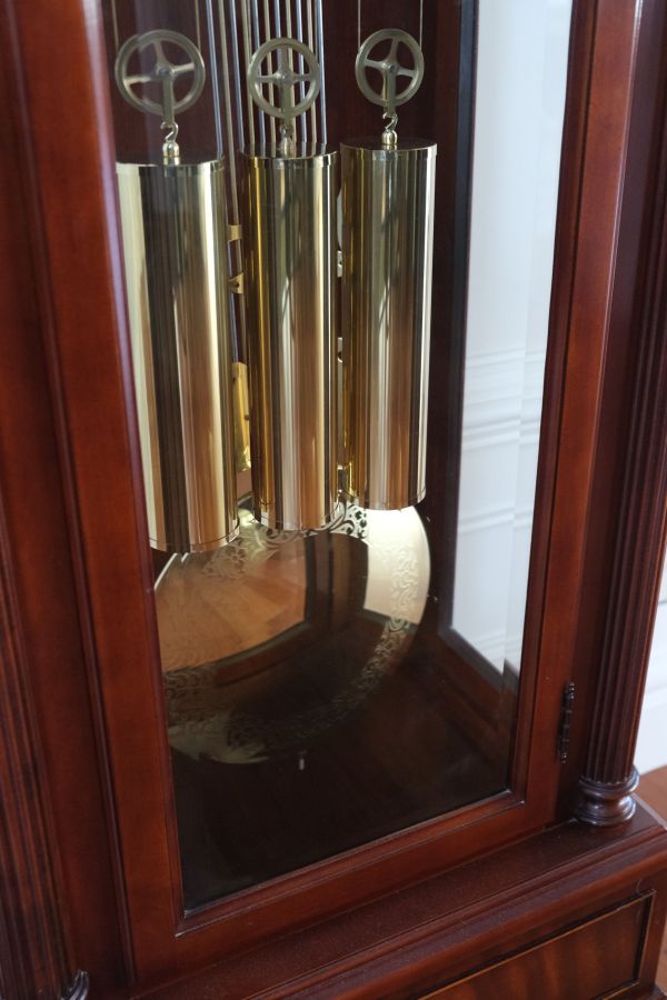However, the unique feature of this clock is the Westminster chimes on five tubular bells, one tube extending all the way to the inside bottom of the case. The chime hammers are driven by a large pin drum located on the top of the movement. The sound is not overly loud but melodious.