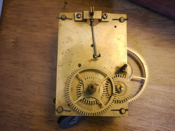 When I removed the movement I noticed additional screw holes. So, it seems to be a later fix, but why? Is the movement a replacement? If so, why bother with such a cheap clock? A mystery to be sure.
