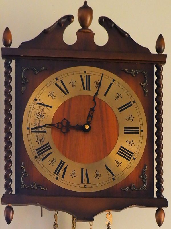 The style of the clock is a “wag on the wall”. It is a strange name but basically, it is a clock with the movement enclosed in a small case and with a pendulum and weights exposed.