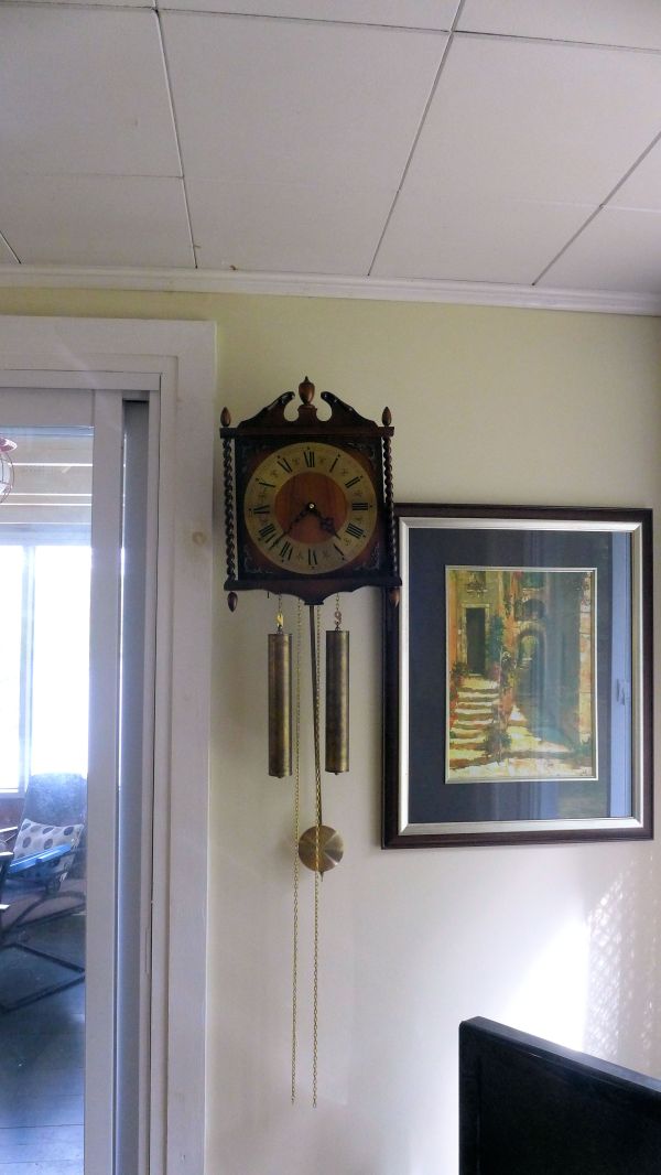 The only markings on the movement are a serial or production number ending with 65 behind the pendulum leader and UW 7/29 (a date or other measurement) just above the aforementioned number. The year 1965 seems about right judging from the two-tone case tinting popular in the 1960s, The clock case is not particularly attractive today but such was the style at the time. I don’t think it will ever be my favorite wall clock.
