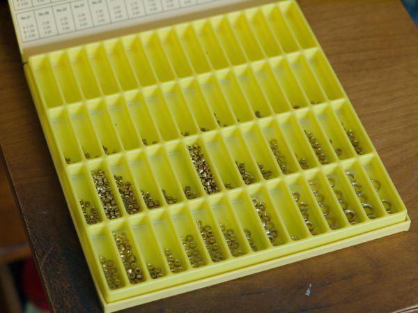 A brass bushing awaits punching into a clock plate