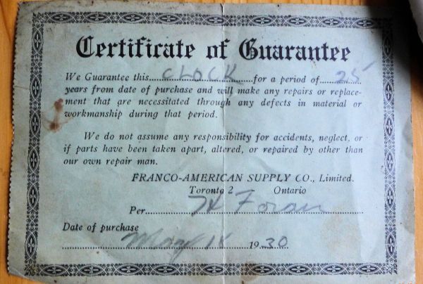 There is a “certificate of guarantee” from the Franco-American Supply Co. with a purchase date of May 18, 1930. The Franco-American Clock Co. became the Franco-American Supply Co. in 1918/1919. Their business eventually expanded to musical instruments, including gramophones. They operated as a distributor rather than a manufacturer, specializing in supplying clocks at a mid-level scale to retailers.