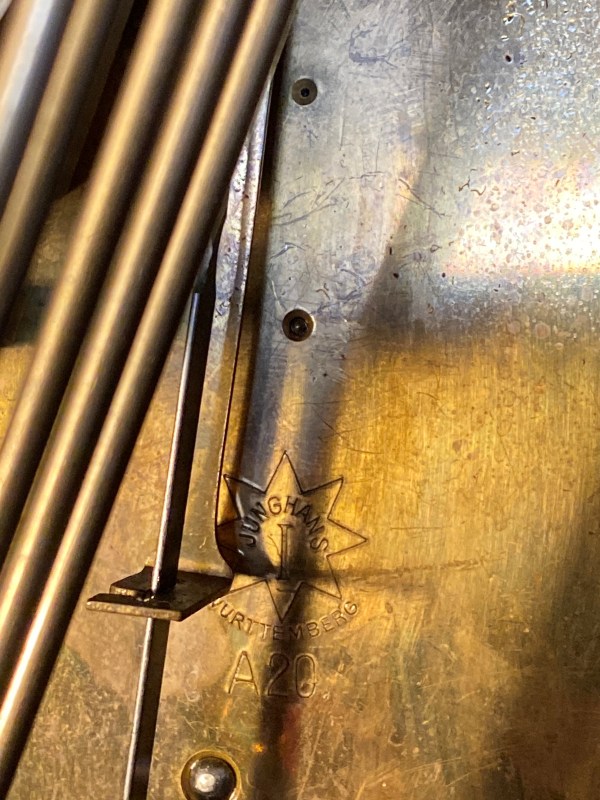 The clock has a “false plate,” a cast-iron skeleton frame fastened to the front plate of the brass movement, with the dial attached to this frame. Stamped on the plate is “BIRMm,” referring to Birmingham, England, the birthplace of this time and strike movement.