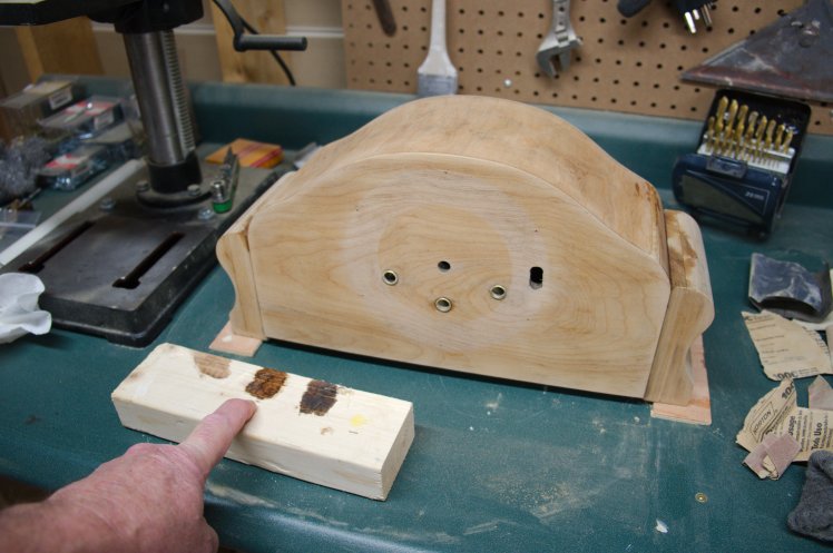 Choosing the right stain; part of the case is still drying off from a wipe down with a damp cloth
