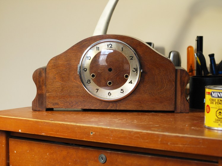 The example is a Fleet time and strike mantel clock from the 1930s. Fleet Time Company of Montreal, a company that was operating four short years, sourced movements from Germany prior to the Second World War. It was a very common mantel clock sold through department stores across Canada.