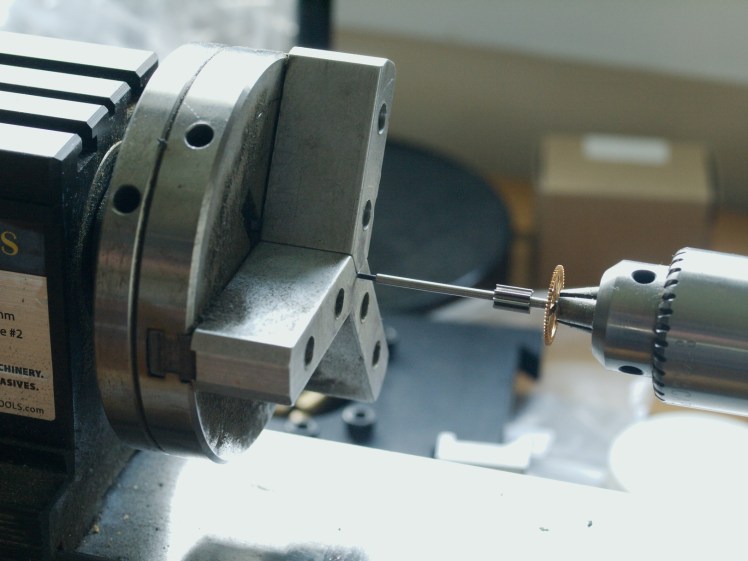Using a mini lathe I began with a centering bit and then with high-speed bits drilled holes in both ends of the escape wheel to a sufficient depth to anchor the pivot wire. I have a good supply of pivot wire and it was a matter of selecting the correct size, which in this case is 1.35mm wire.