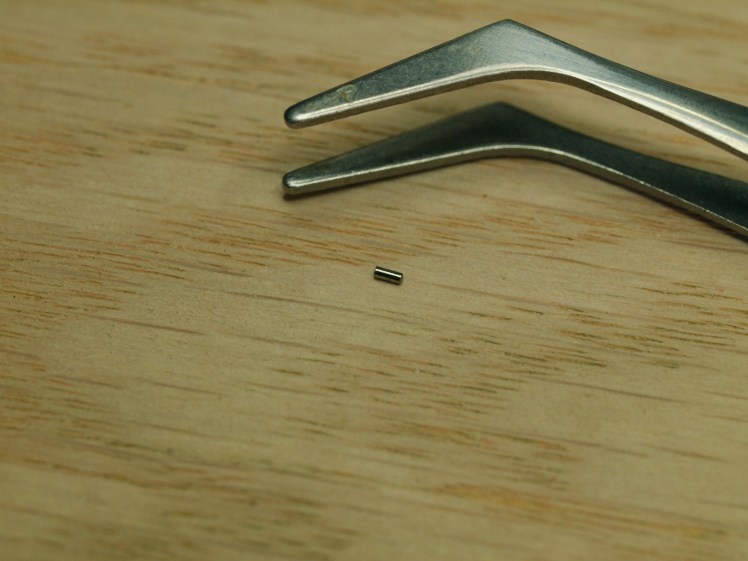 I was not even aware that I was putting undue pressure on the pivot as I was carefully guiding each pivot in place with a pivot locator. However, either I applied too much pressure or it was ready to go because I broke a pivot. To give a sense of how small it is, here it is beside a pair of tweezers.