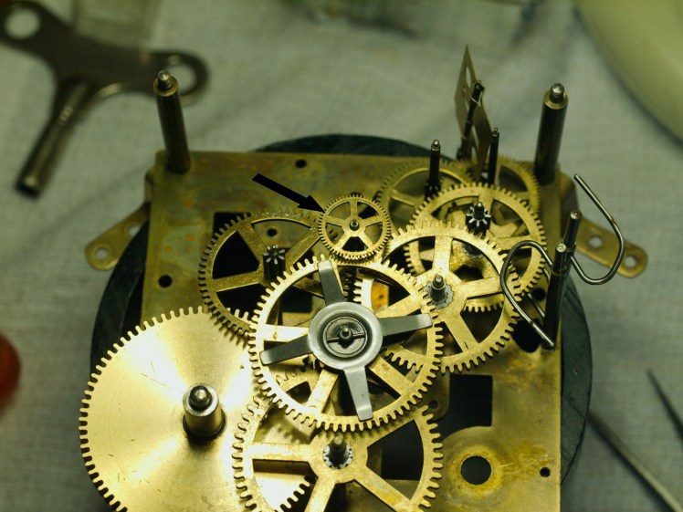 When working with German and French movements one must always be very careful of the delicate pivots. Normally when I work on these clocks I am aware of how easy it is to bend or break a pivot and this clock was no exception. However, I had the movement apart and was reinstalling the gears to determine bushing wear and went about repositioning the center gear when I noticed its centre cannon front plate pivot had sheared off.